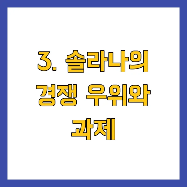 솔라나는 이더리움, 아발란체, 폴카닷 등 다른 레이어 1 블록체인 플랫폼과 치열한 경쟁을 벌이고 있습니다. 솔라나의 가장 큰 경쟁 우위는 바로 압도적인 속도와 낮은 수수료 입니다. 하지만 과거에 발생한 네트워크 중단 사태는 솔라나의 아킬레스건으로 작용하고 있습니다. 이러한 문제를 해결하고 안정성을 확보하는 것이 솔라나의 지속적인 성장을 위한 중요한 과제입니다.